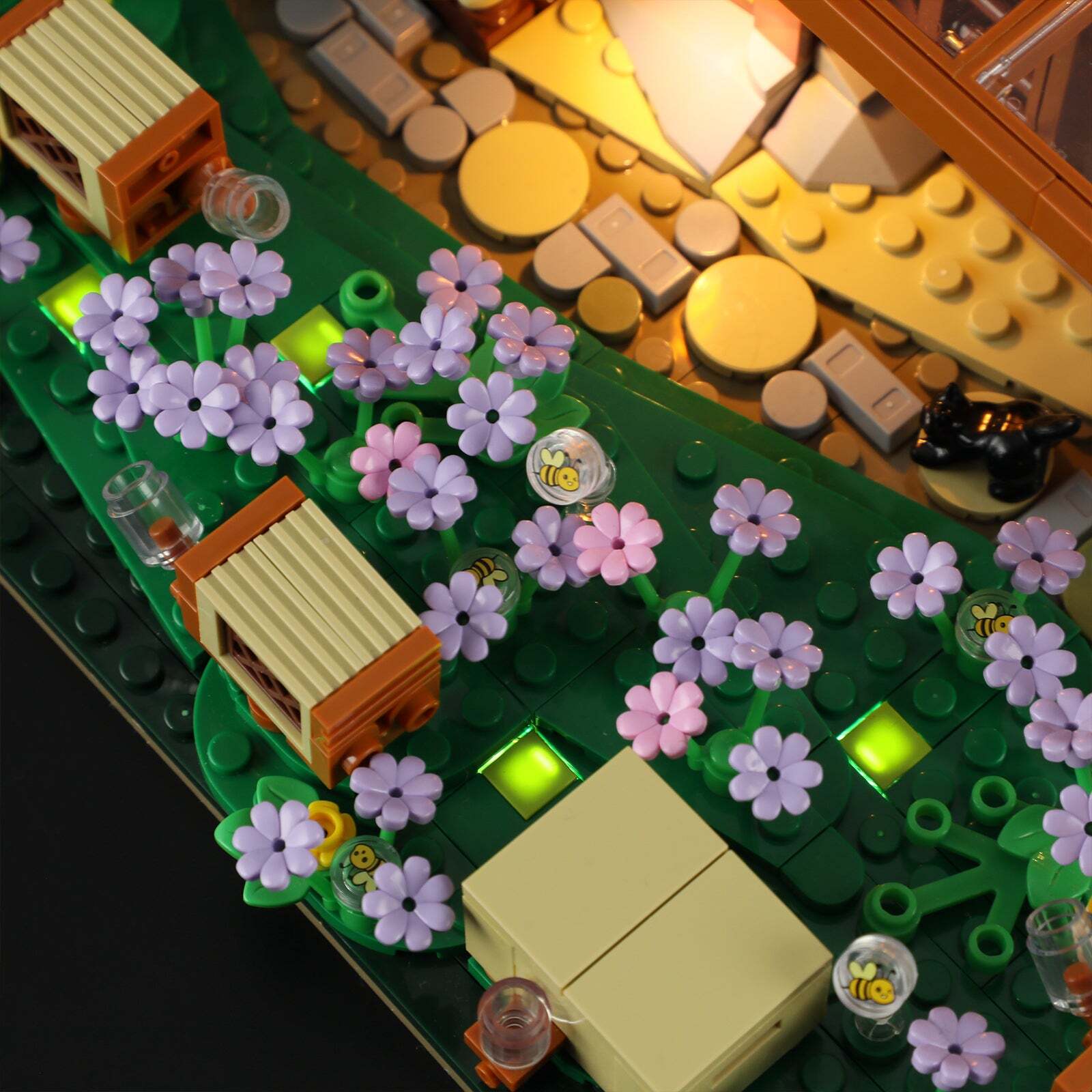 [Original Lighting Design]The Product Features 10 Light Points, With 6 Located Around The Flower Field And House, Using A Breathing Light Effect To Simulate Fireflies In A Forest At Night; A Hanging Light At The Cottage Door, Another Inside, And Two Lanterns In The Tool Shed, Creating A Warm.