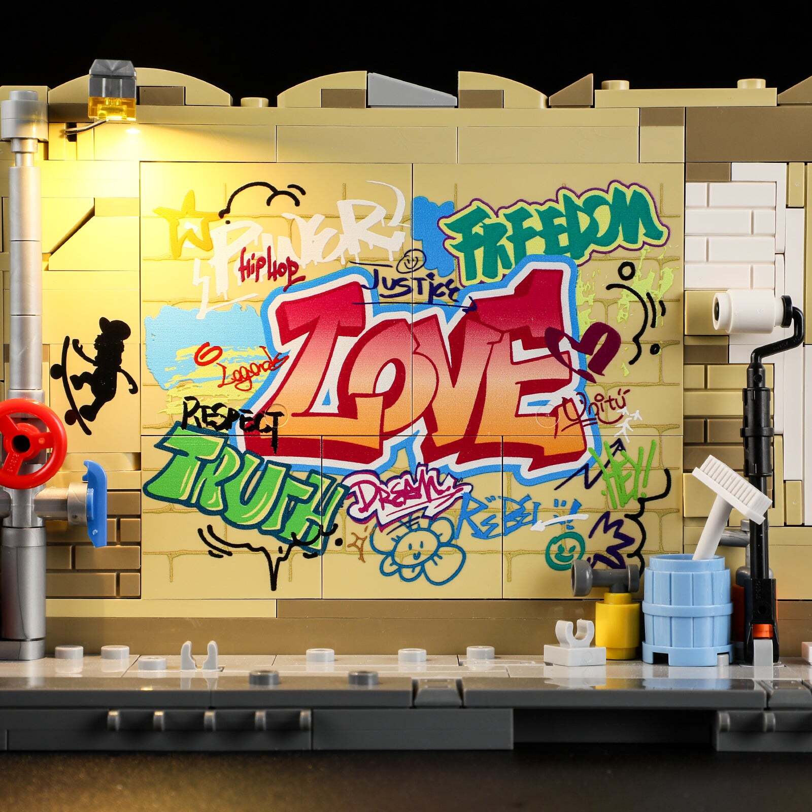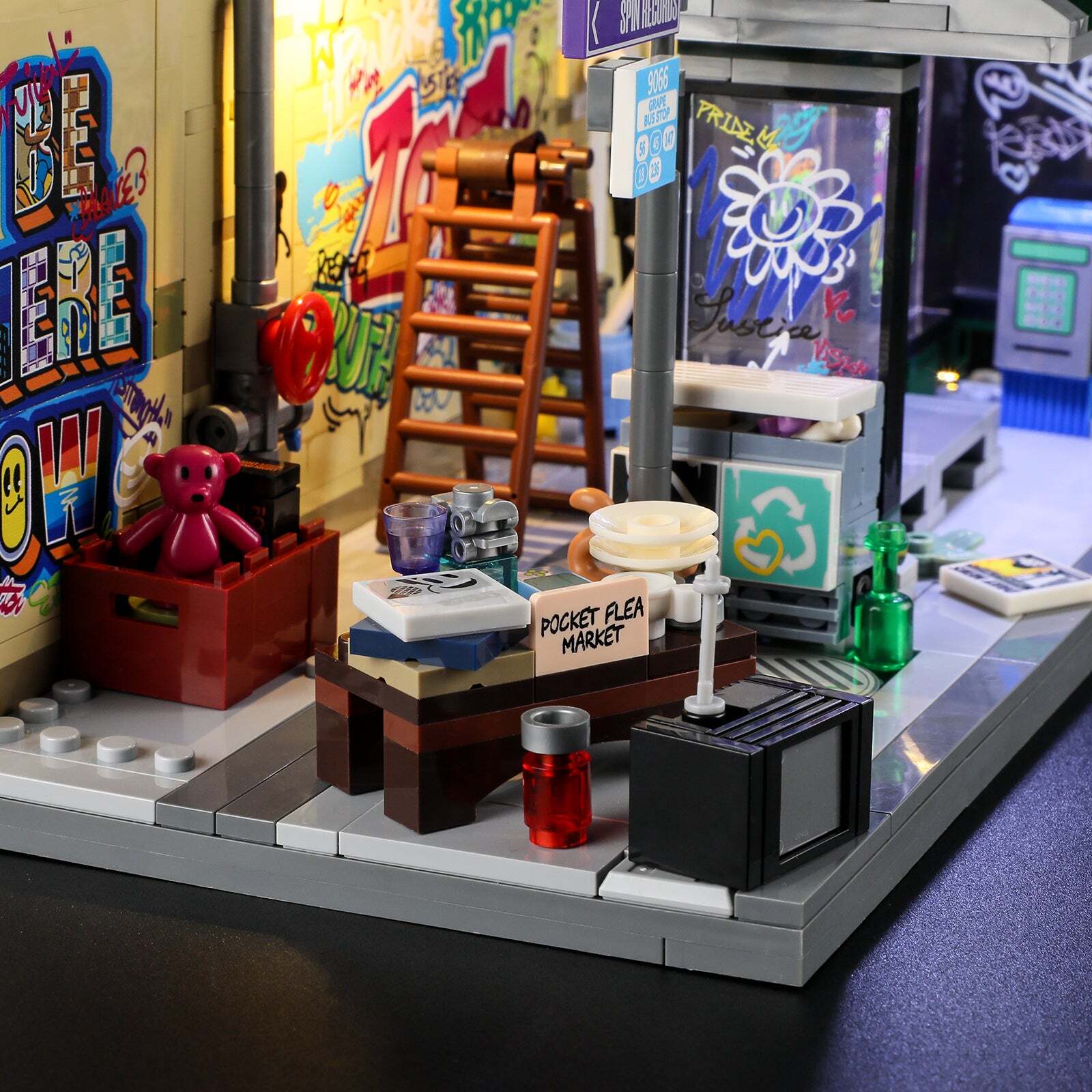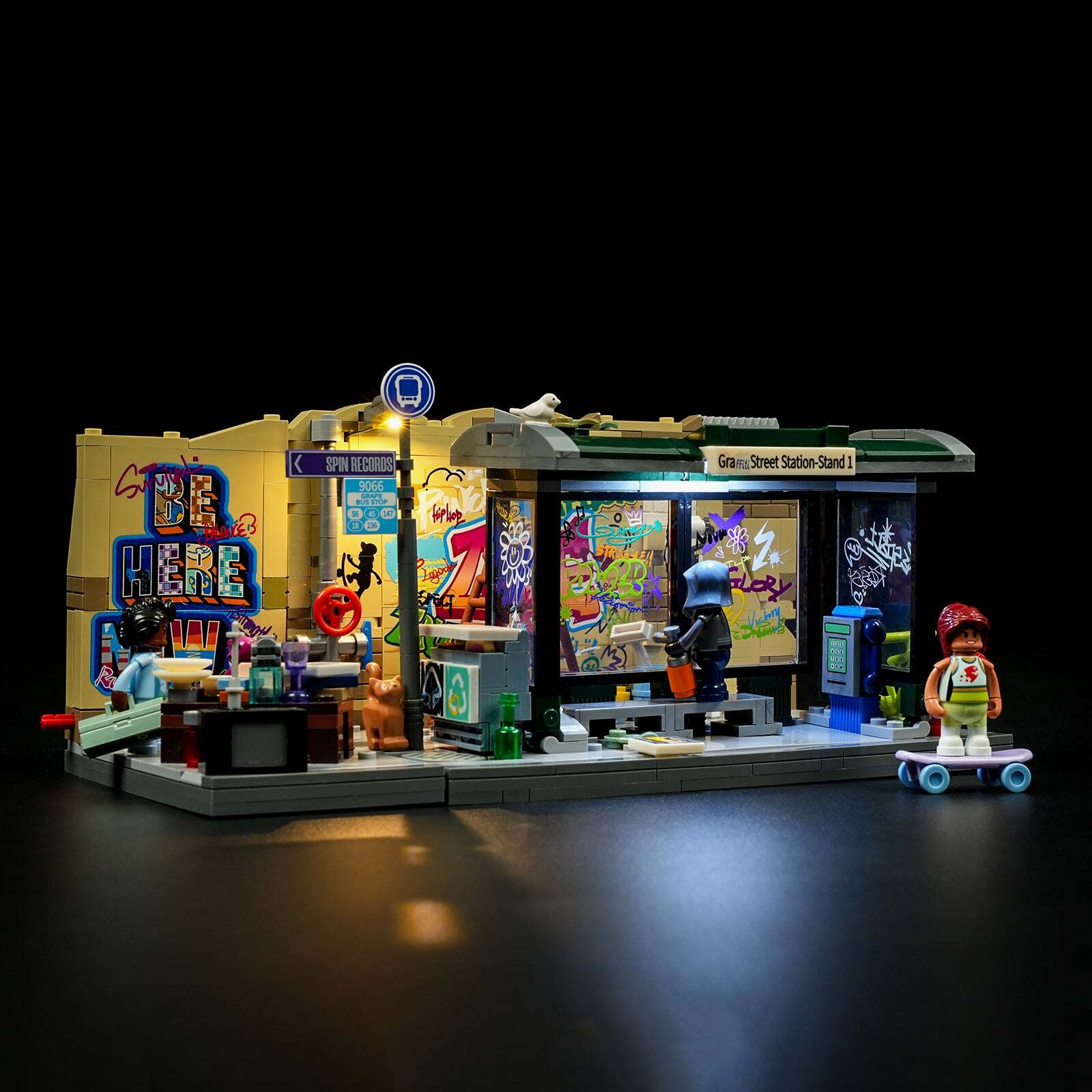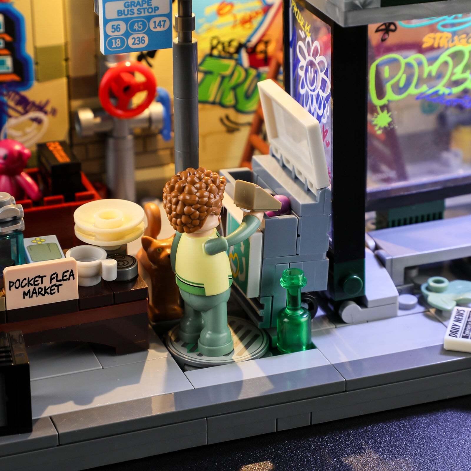 [Integrated Design Of Lights And Blocks]The Top Of The Bus Stop Adopts Incandescent Light Panels, And The Graffiti Wall Is Equipped With Warm Yellow Street Lights That Can Be Rotated To Shine Left And Right. Lighting Accessories And Block Sets Are Designed To Achieve The Effect Of 1+1>2.