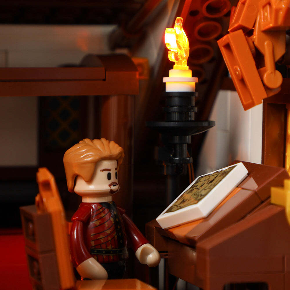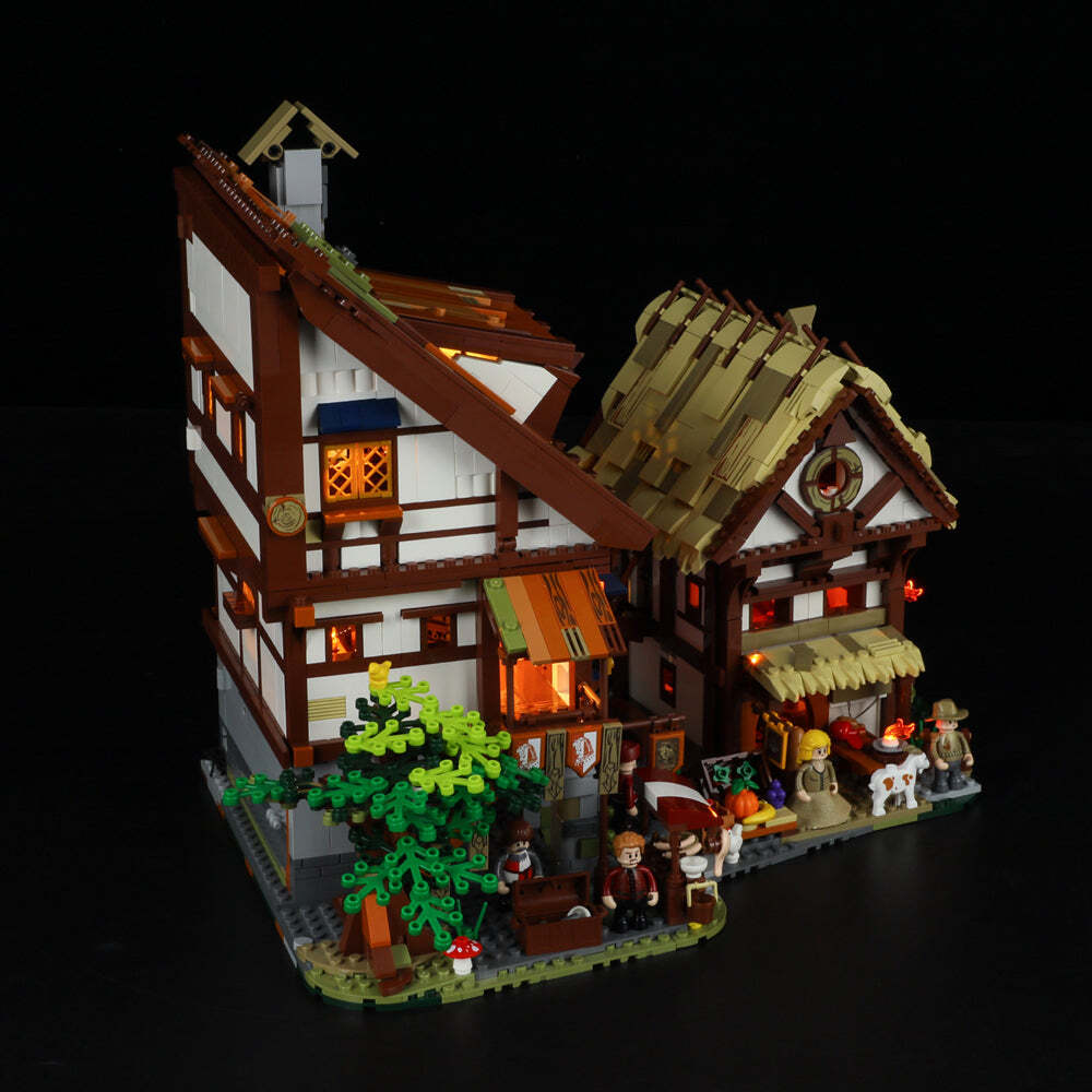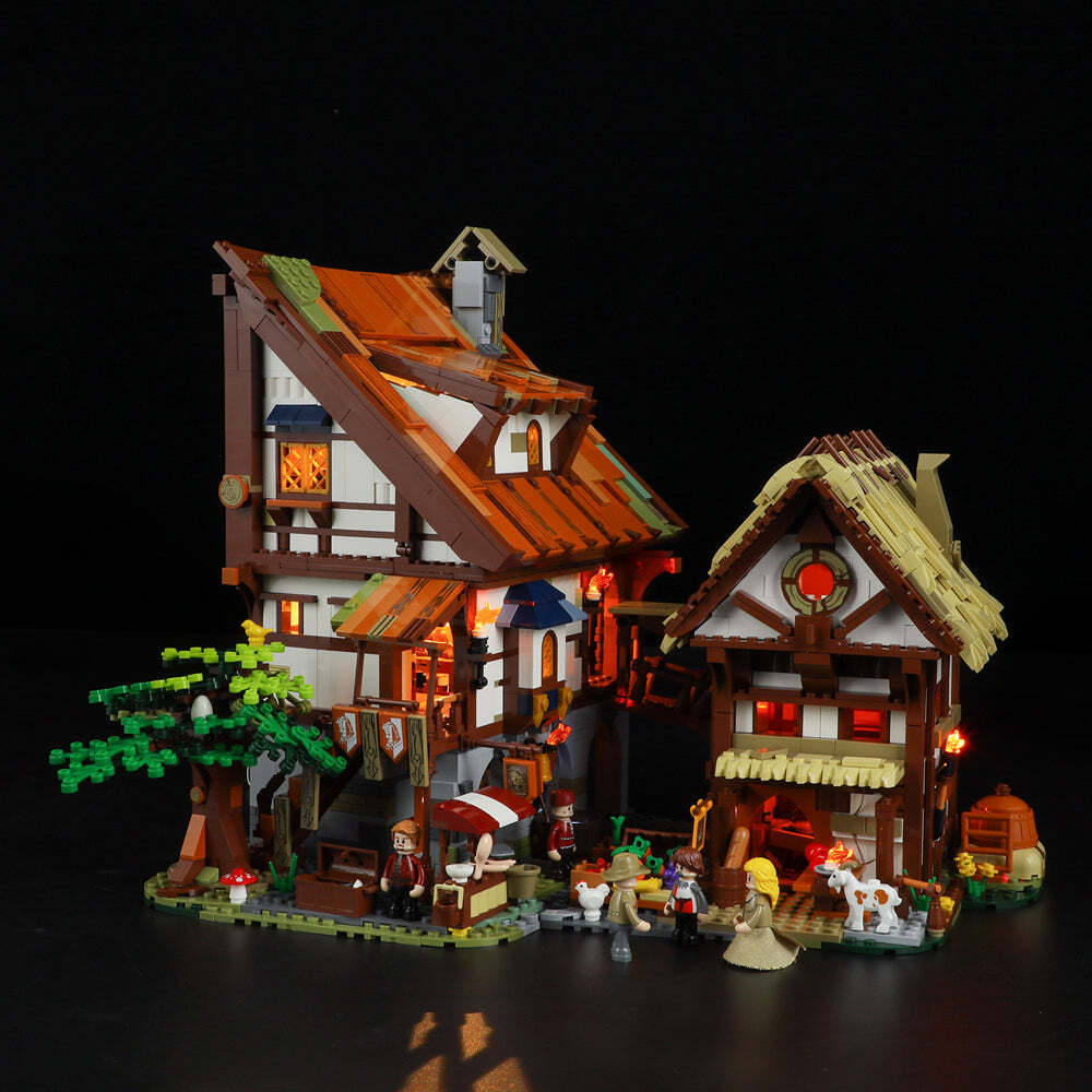 Return To The Bustling Medieval Market: Two Complete Buildings Located Near The Town’s Public Gathering Square Contain Various Functional Spaces, Including An Armory Shop, A Bakery, A Town Council Chamber, A Private Residence, And A Loft For Storing Goods, While Outside Is A Wide Square Street. Authentic Lighting Design: The Lighting Design Of Different Locations Within The Scene Includes Fireplaces, Beeswax Candles, Torches And Bowls Of Butter Candles. Outside, The Lights Staggered And Flickered To Simulate The Effect Of Being Blown By The Wind. The Warm Orange Lights Inside Stay On, Just Like The Lights In The Townspeople’s Homes At Night.Building Details: The Building With The Dark Orange Roof Can Be Opened Up To The Rear Wall Or Lifted Off The Third Floor To See The Interior Armory, The Town Hall And The Overseer’s Residence On The Top Floor. Buildings With Apricot Roofs Can Be Opened By Opening The Back Wall To See The Baker’s Workplace And The Merchant’s Private Bedroom. Through The Door Of The Merchant’s Bedroom, There Is An Outdoor Corridor That Leads To The Town Council Building.A Great Collection For Fans Of Medieval Style: This 2614 Pieces Medieval Market Model Comes With Two Instruction Books, Including Clear Instructions For Lighting Installation And Assembly, Making It Easy For Beginners To Build Their Own Medieval Scene In Step-By-Step Stages. It Is Suitable For Block Enthusiasts Who Are Passionate About Creating Medieval-Themed Backdrops.